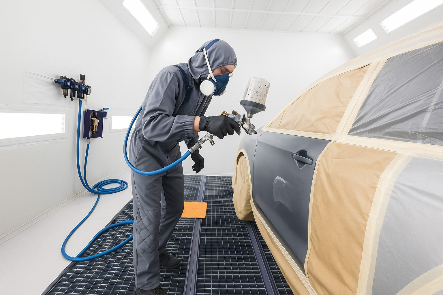 Nous appliquons des finitions opaque, métallisé, nacré, tricouche avec masquage adapté et application en cabine pressurisée. Notre laboratoire de teintes s’appuie sur la colorimétrie assistée par ordinateur pour garantir la cohérence sous différents éclairages.